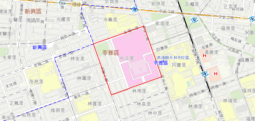 行政區域範圍: 東起‥和平一路與高雄師大為鄰 西至‥光華一路 北起‥五福一路和五福國中相鄰 南至‥林德街 |